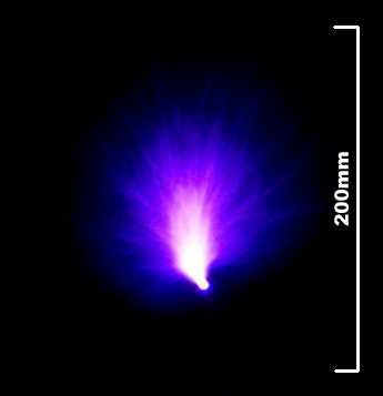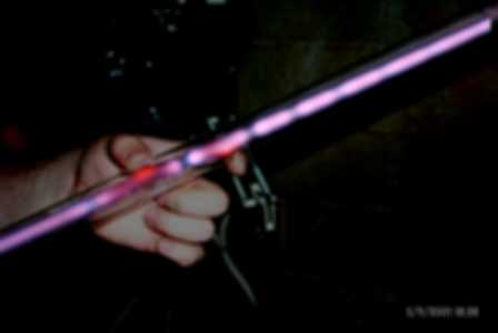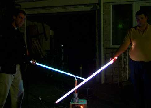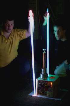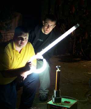 Indra showing a 150 mm normal arc - Indra lighting fluorescent tubes held by 2 of our technicians. |