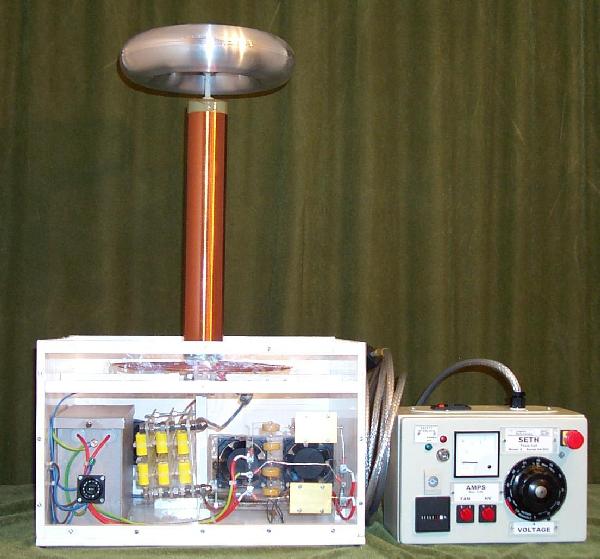 | ___The Seth tesla coil was designed in early 2000 as an easily portable demonstration unit, transportable in the boot of even the smallest car and can be assembled in ten minutes. It produces arcs of 750 mm in length and consumes 4A at 240 VAC doing so. |